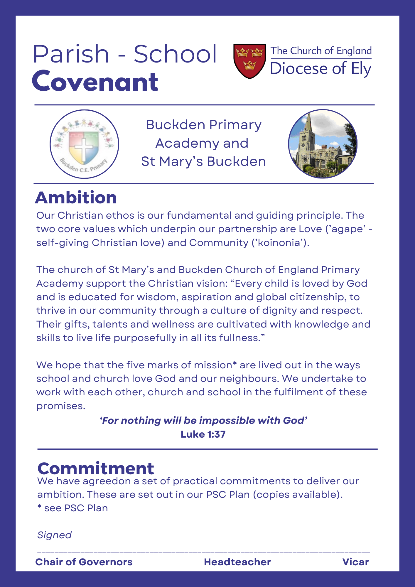 As part of our commitment as a Church School to St Mary's Church, Father David and the foundation committee, which includes members of the school and the parish worked together to put together a Parish-School Covernant. We have celebrated this both at St Mary's and at school and are very proud to have a signed copy displayed in St Mary's and Buckden CE Primary Academy to show our commitment to the church.