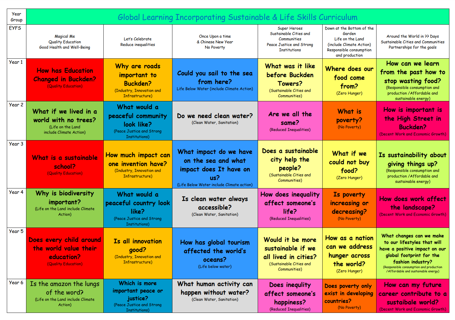 Our curriculum is multi-faceted, formulated around the 17 Sustainable Development Goals. It gives opportunities to revisit goals and develop a great depth of understanding building on prior learning. It is facilitated by an enquiry based approach which encourages ‘Big questions’ to consider how our history has and continues to shape our future. The curriculum inspires hope, courageous advocacy with an understanding that ‘doing what we can, can make a difference’ and as our school song says we have “The World on Our Shoulders”.